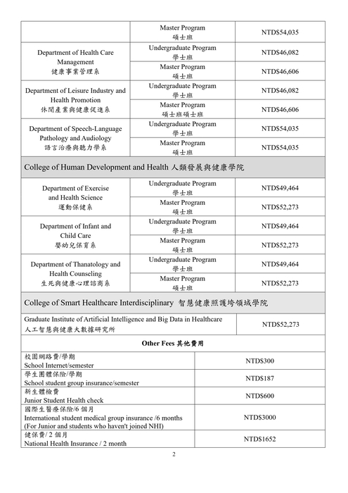 國立臺北護理健康大學收費標準(費用以當年度公告為主)